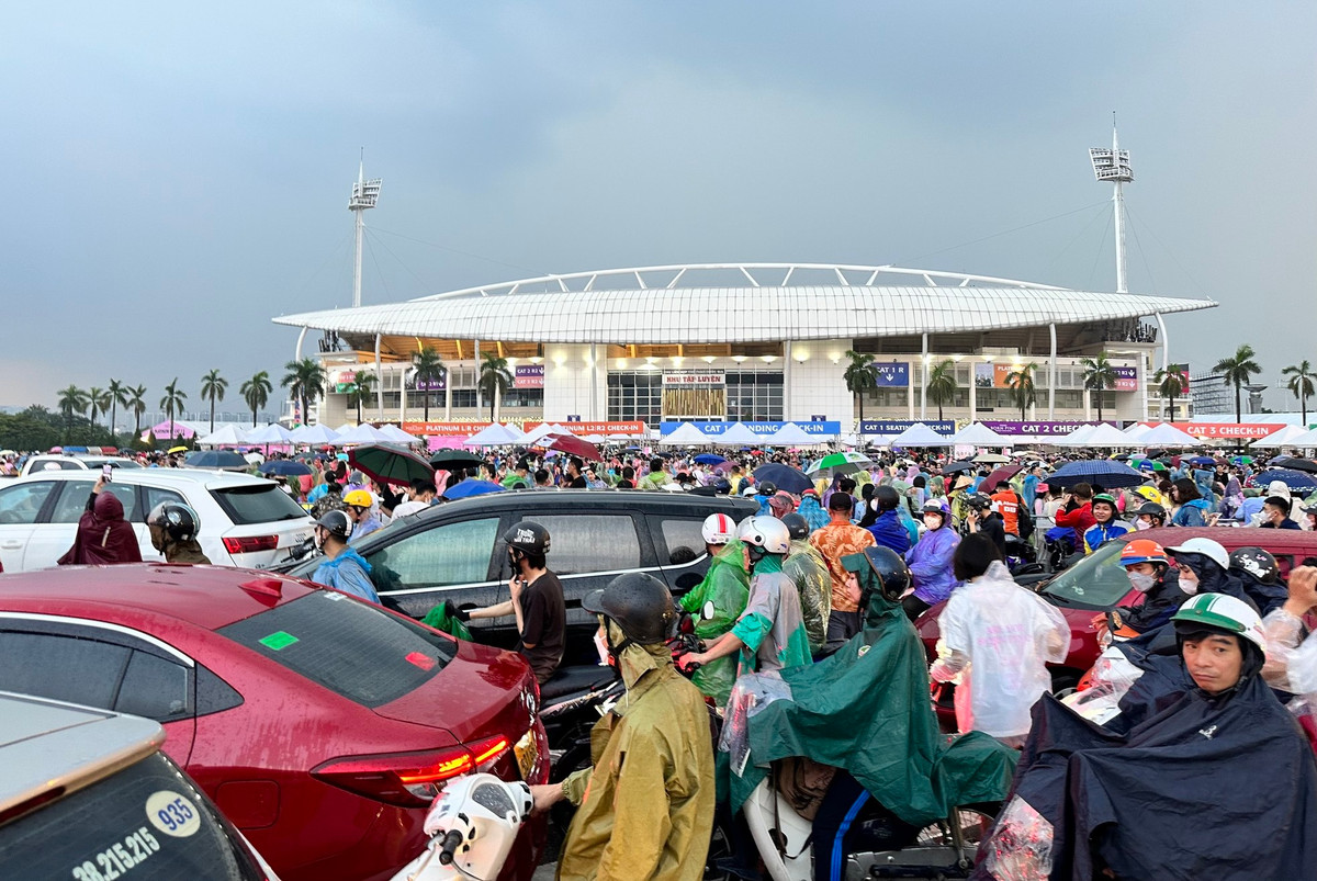 Sau trận mưa lúc 17h20, giao thông trên đường Lê Quang Đạo, trước cổng sân vận động Mỹ Đình, Hà Nội (nơi tổ chức show diễn BlackPink) ùn tắc nghiêm trọng.