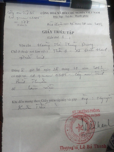 | Mặt trước và mặt sau giấy triệu tập nhân chứng của Công an tỉnh Bình Thuận. |