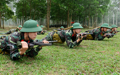 Cán bộ sửa tập, uốn nắn cho các chiến sĩ động tác nằm bắn súng tiểu liên AK.