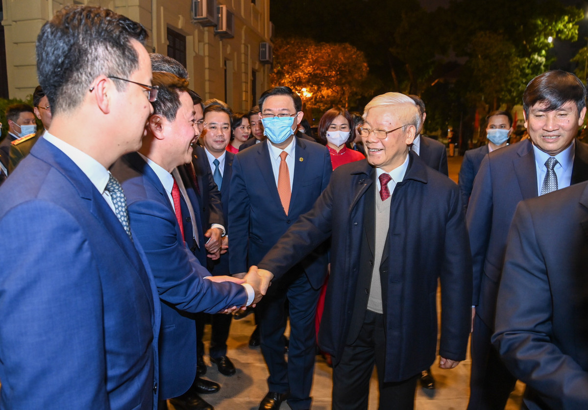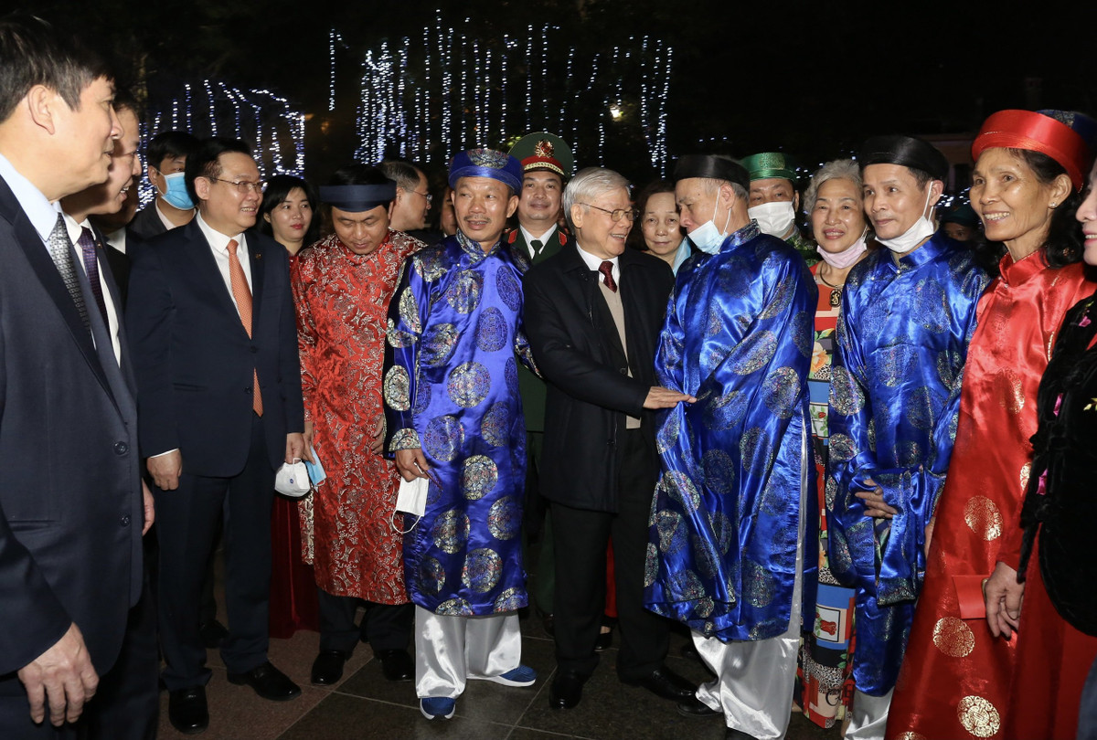 Tổng Bí thư, Chủ tịch nước Nguyễn Phú Trọng trò chuyện, thăm hỏi, chúc Tết bà con nhân dân vui đón giao thừa tại khu vực Hồ Gươm.