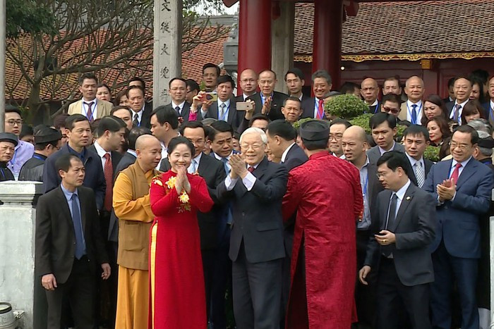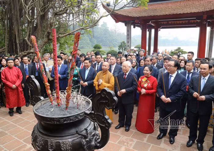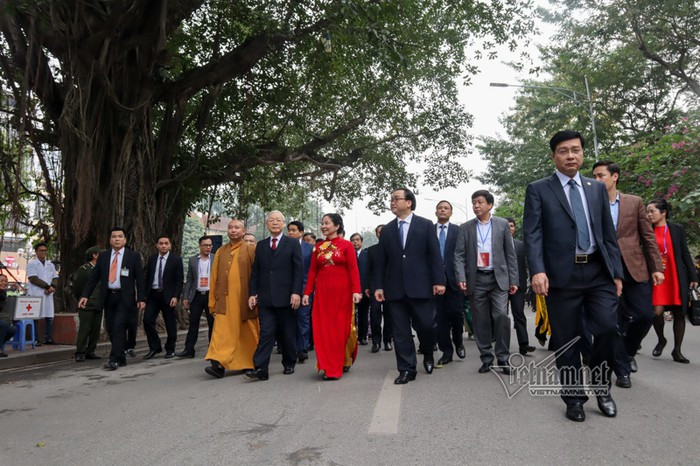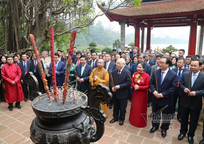 Tổng bí thư, Chủ tịch nước và phu nhân cùng đoàn vào đền Ngọc Sơn dâng hương.