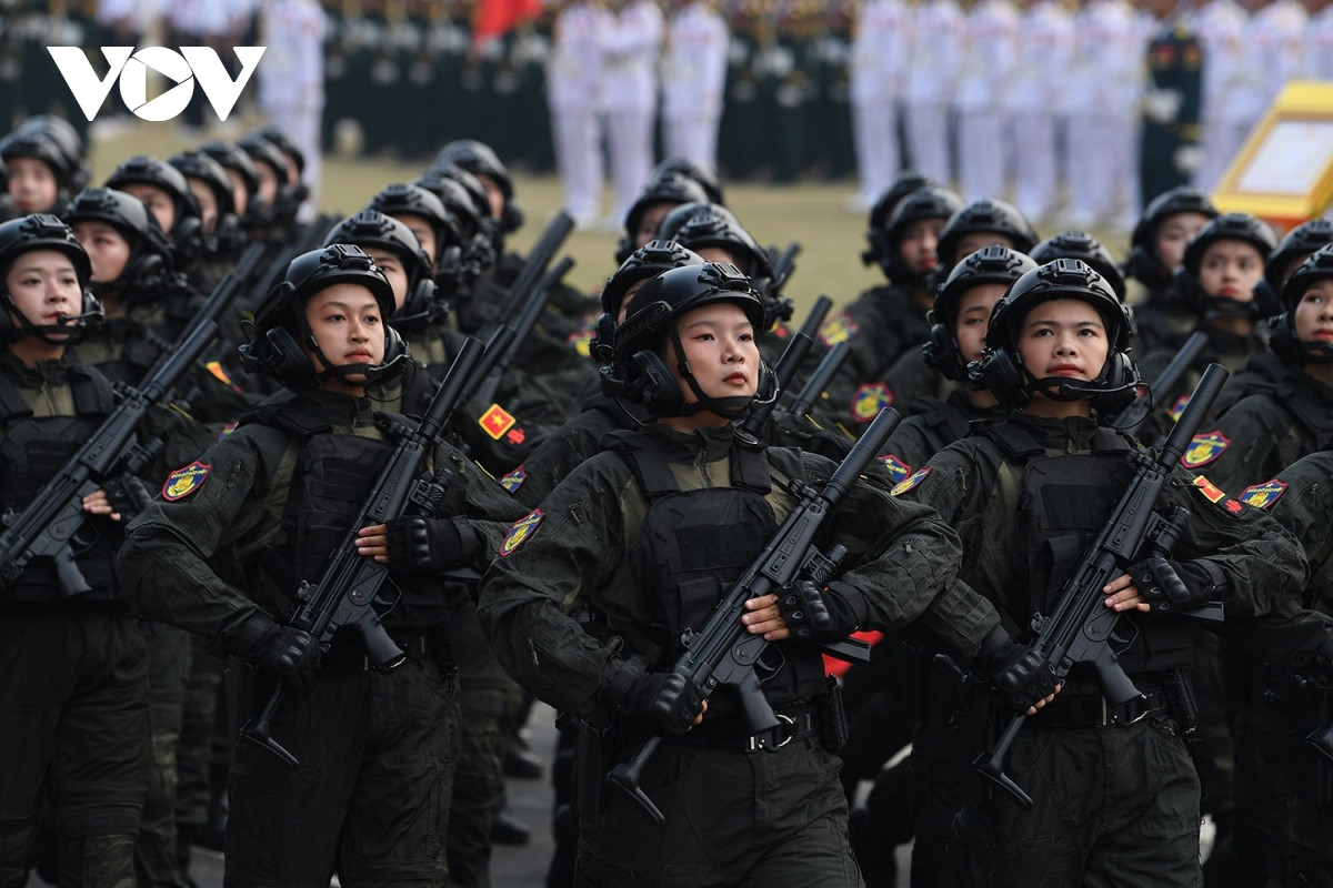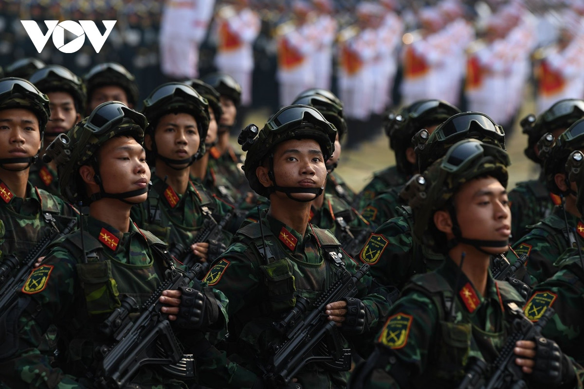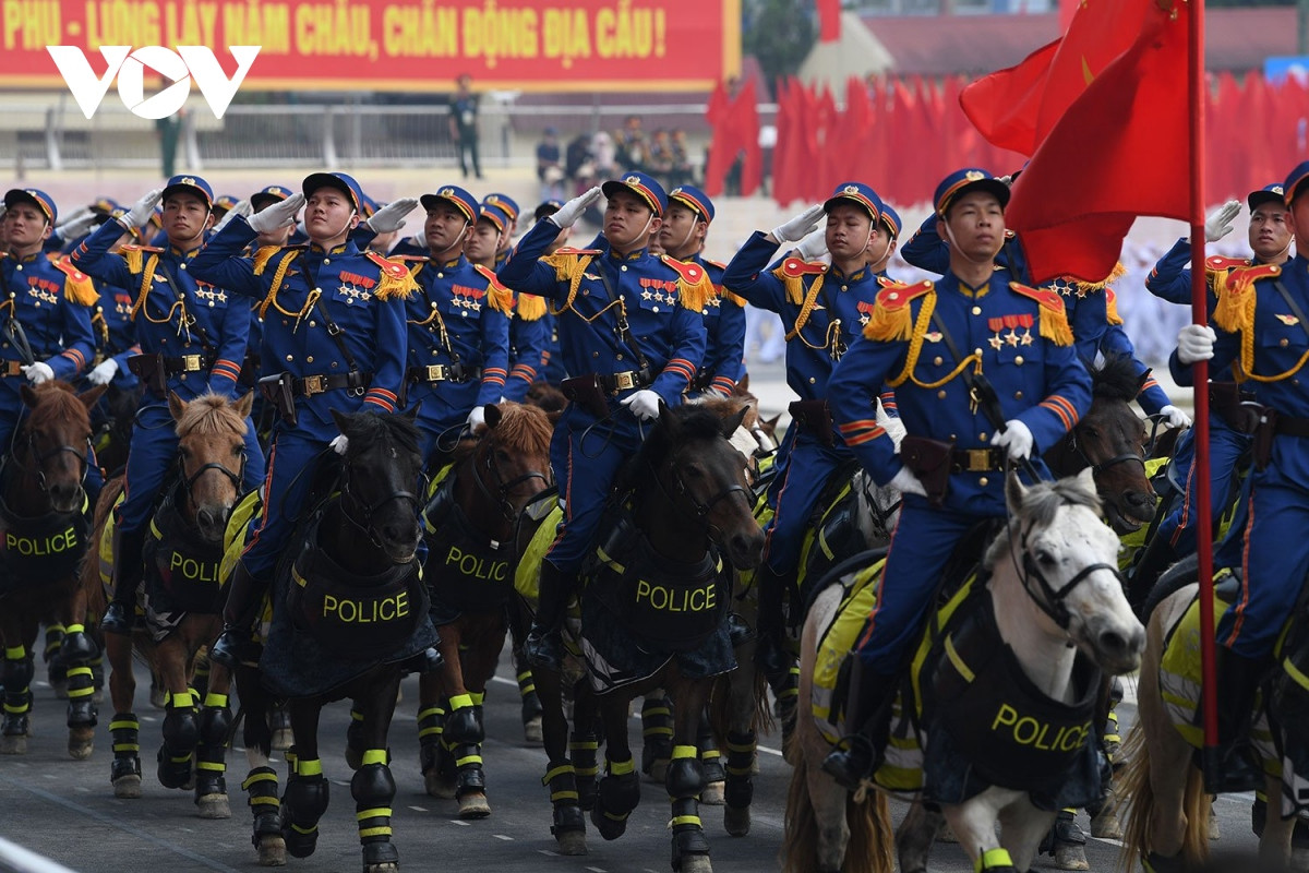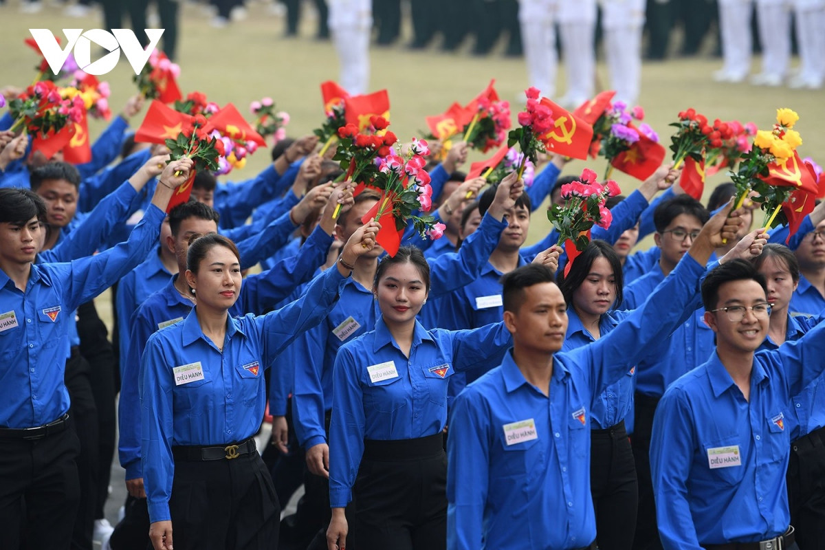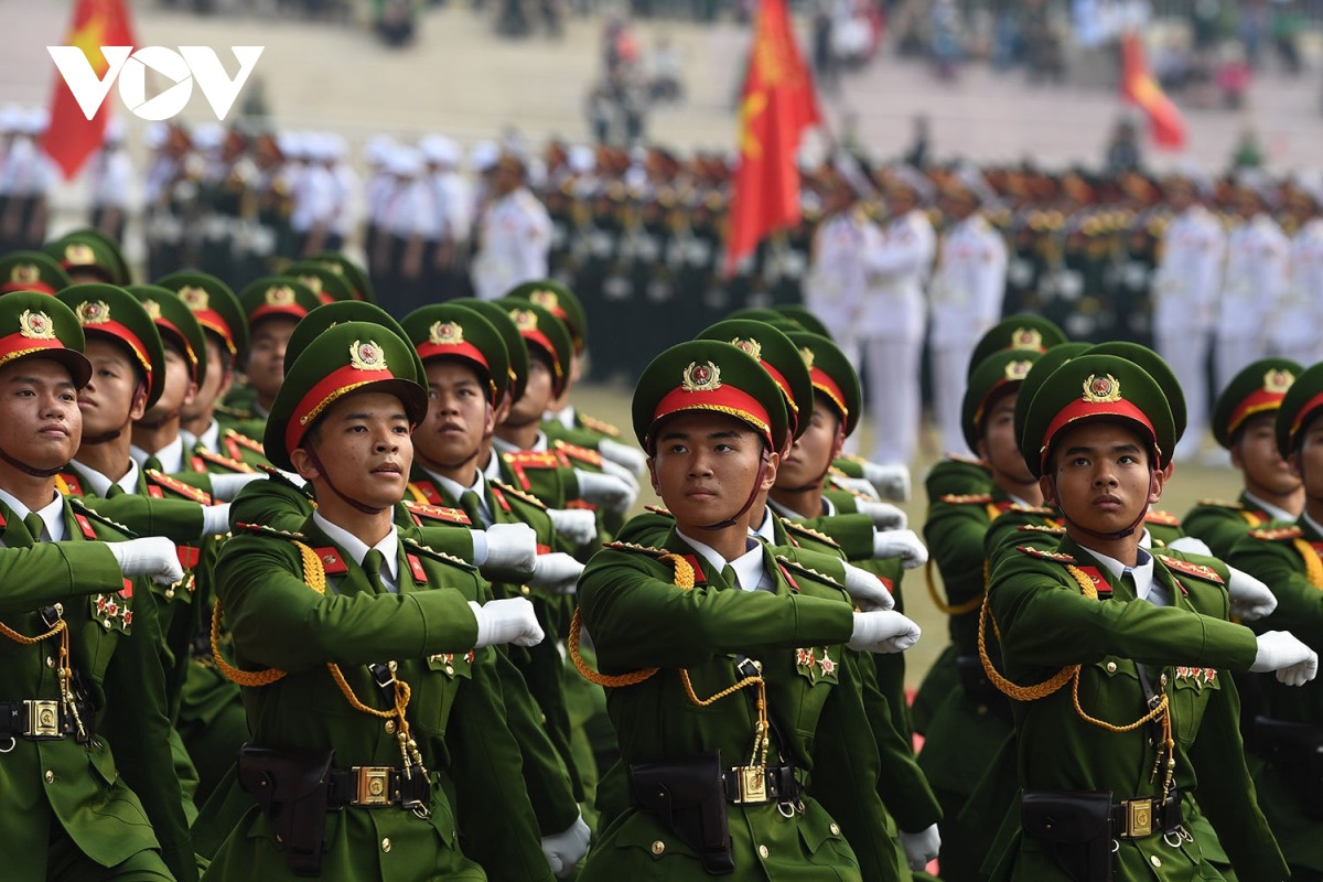Các khối nghi trượng và đội hình diễu binh, diễu hành tiến vào lễ đài. Đi đầu là Quốc huy nước Cộng hòa Xã hội Chủ nghĩa Việt Nam.