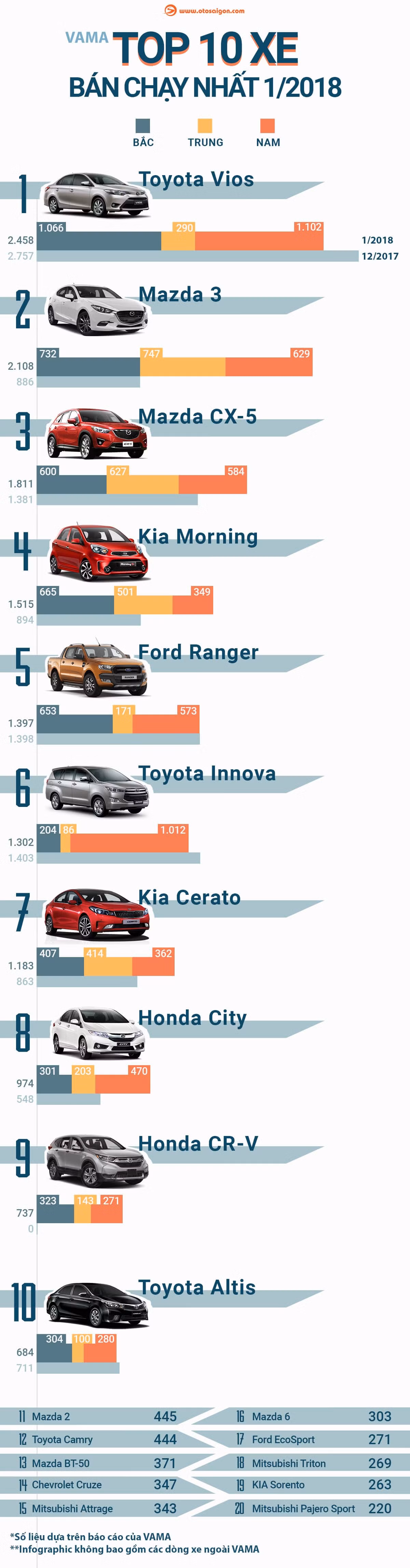 Top 20 mẫu ôtô bán chạy nhất Việt Nam tháng 1/2018