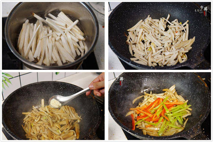- Đổ nước gia vị đã chuẩn bị vào chảo, thêm nửa bát con nước vào, đảo đều, đậy vung đun nhỏ lửa khoảng 5 phút. Tiếp tục thêm 1 thìa dầu mè, chút muối, hạt nêm, nêm nếm gia vị, vặn nhỏ lửa cho cạn nước rồi dọn ra đĩa.