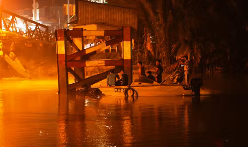 | Lực lượng chức năng nỗ lực tìm kiếm các nạn nhân rơi xuống sông sau vụ sập cầu. |