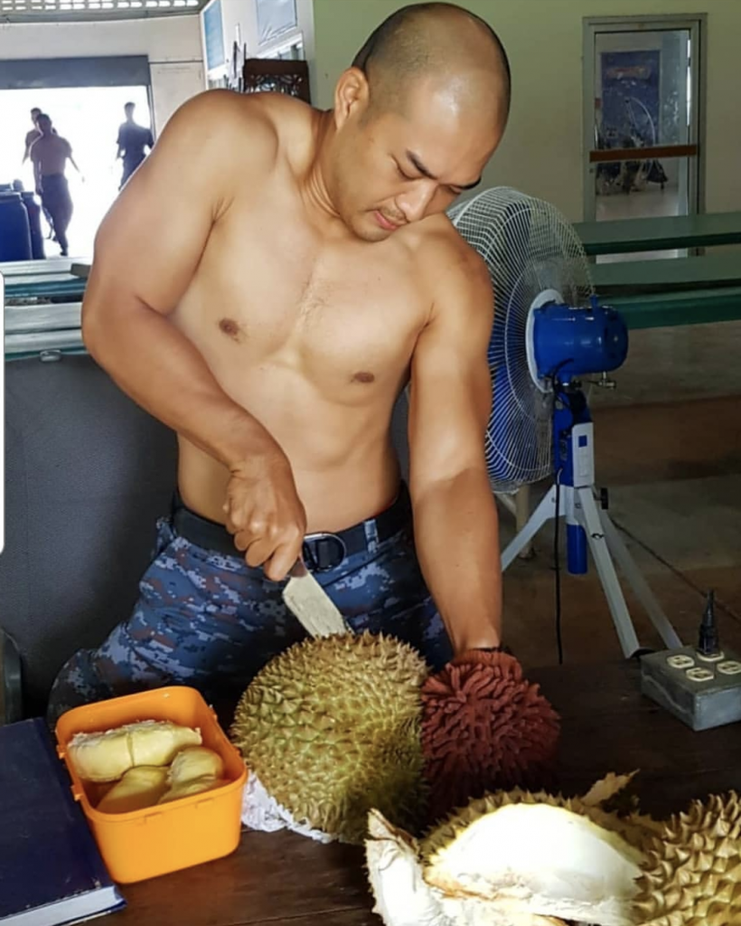 Các chàng trai khỏe mạnh, rắn chắc khoe hình thể với sầu riêng.