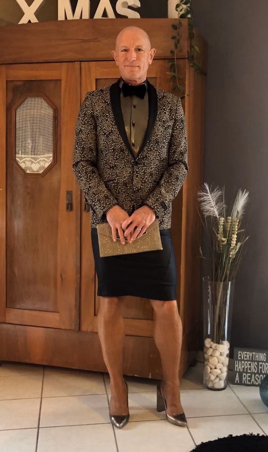 Thậm chí, người đàn ông này còn không ngại diện váy da bó ôm sát cơ thể. Tư thế tạo dáng của Mark cho thấy ông đã quá quen với việc đi giày cao gót mỗi ngày. Ảnh: Bored Panda.