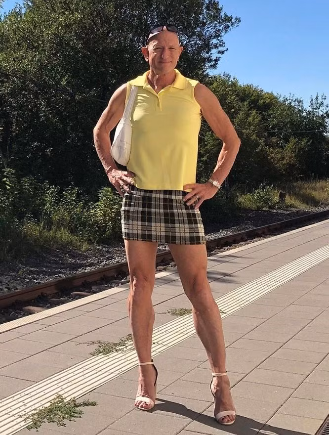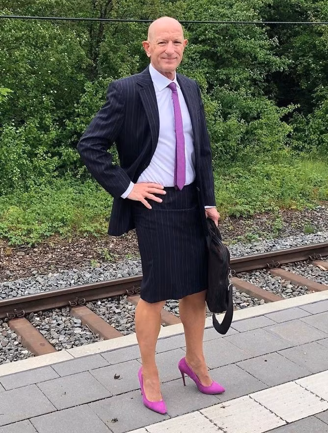 Những món đồ tạo nên xu hướng hiện nay như váy kẻ sọc, họa tiết da thú, túi kẹp nách... cũng được Mark nhanh chóng sở hữu. Kể cả khi không đi làm, ông vẫn giữ thói quen diện chân váy ngắn cùng giày gót nhọn. Ảnh: Bored Panda.
