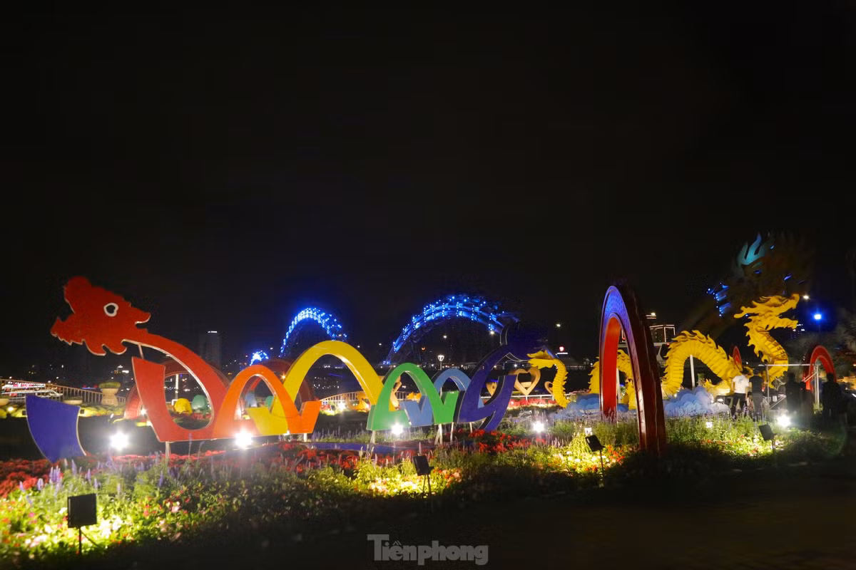 Vào ban đêm, các linh vật rồng quanh cầu Rồng lại càng thêm lung linh, huyền ảo bởi những ánh đèn.