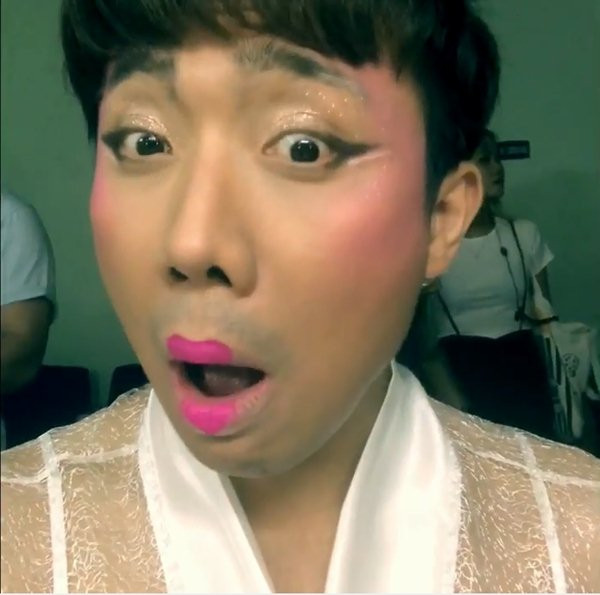 Trang điểm đậm cùng son môi đỏ thắm dường như là phong cách của anh.