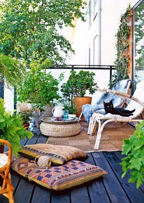 Khi mùa xuân ấm áp gõ cửa, không khí sẽ bớt lạnh giá đi. Vì vậy, bạn không cần chọn những loại thảm dày cộm, chiếm nhiều diện tích. Thay vào đó hãy lựa những tấm thảm bắt mắt, chất liệu nhẹ nhàng để tô điểm cho ban công. Bên cạnh đó, khi đọc sách, thư giãn ngoài ban công bạn không phải lo đôi chân bị lạnh nữa.