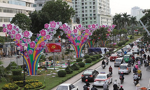 Công tác trang trí đường phố Hà Nội đang được diễn ra. Một số cụm trang trí đón Tết cổ truyền Bính Thân đã hoàn thiện trên đường Nguyễn Chí Thanh.