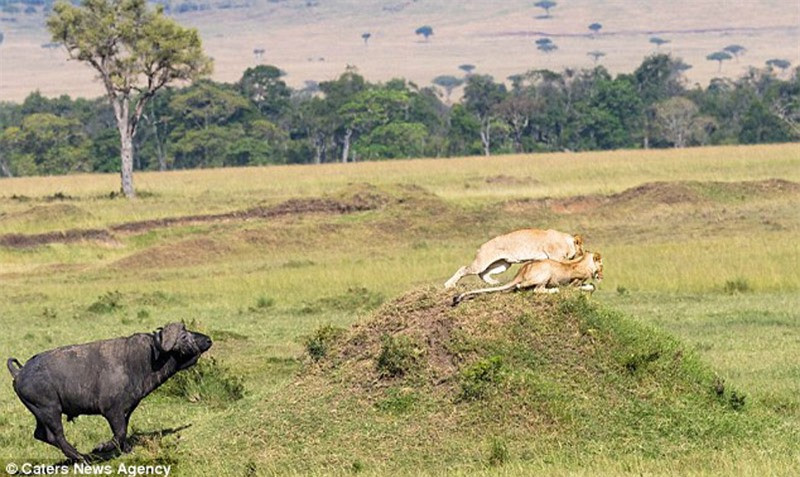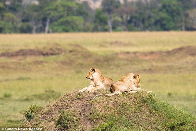 Hai con sư tử nhanh chóng rời khỏi gò đất nghỉ ngơi ưu thích của trâu rừng.