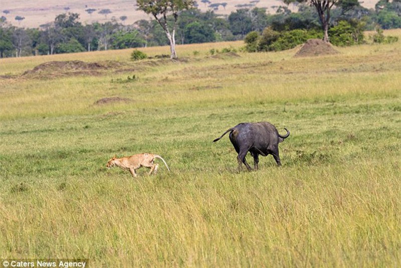 Tuy nhiên, nó phải chấp nhận tháo chạy bởi biết mình không địch lại được con trâu rừng đang lên cơn "điên".
