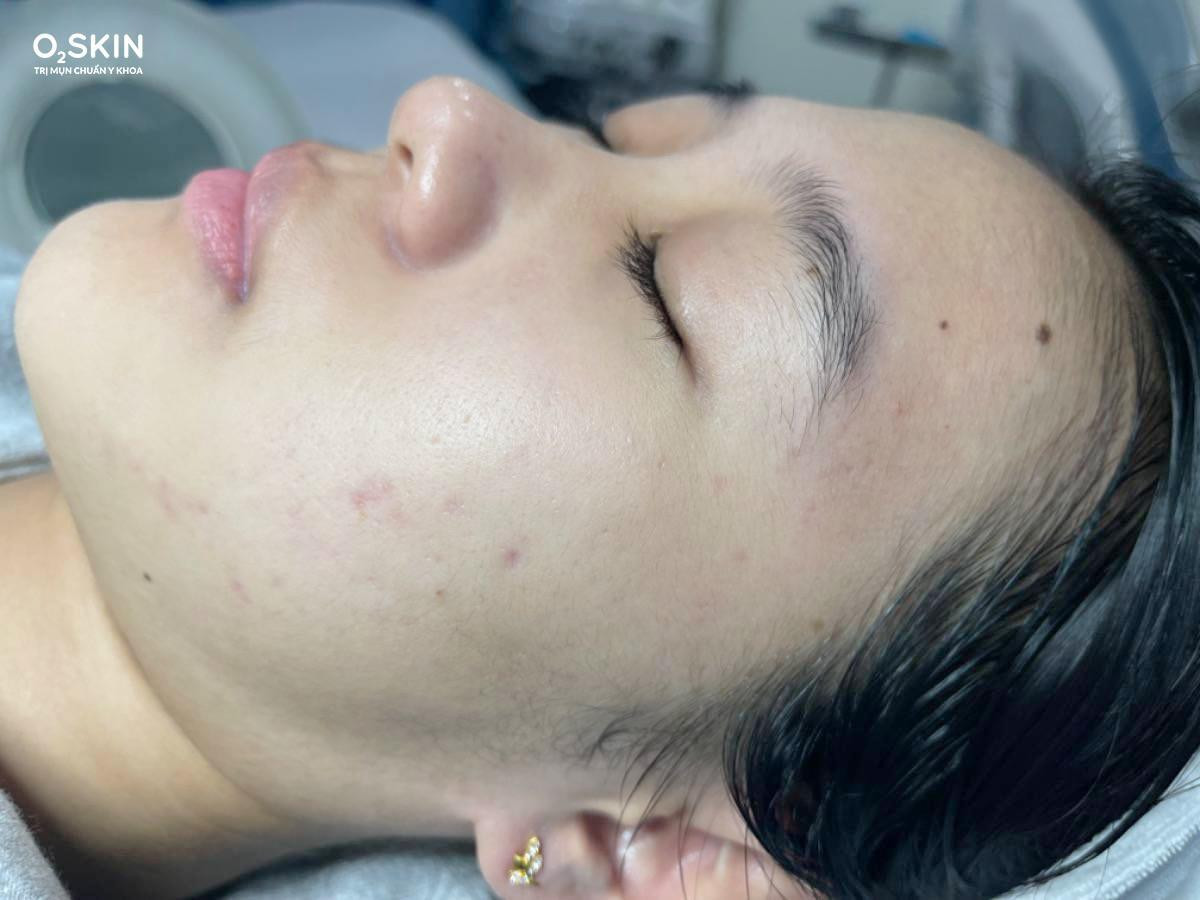 Khi được anh trai giới thiệu đến O2 SKIN và xem các video chia sẻ trị mụn thành công, Minh Vy cảm thấy rất yên tâm và quyết định trị mụn tại đây. Qua thăm khám, bác sĩ đưa ra phác đồ điều trị gồm 2 giai đoạn là kiểm soát mụn, giảm viêm và điều trị thâm sẹo. Thời gian đầu cô bạn được bác sĩ chỉ định uống thuốc điều trị và thuốc bôi, chiếu ánh sáng để làm dịu da, giảm mụn sưng viêm. Sau khi mụn bớt sưng, Minh Vy tiếp tục được chỉ định lấy nhân mụn y khoa kết hợp chăm sóc da chuyên sâu như IPL, Peel, Điện di nhằm làm mờ thâm sẹo và dưỡng sáng da.