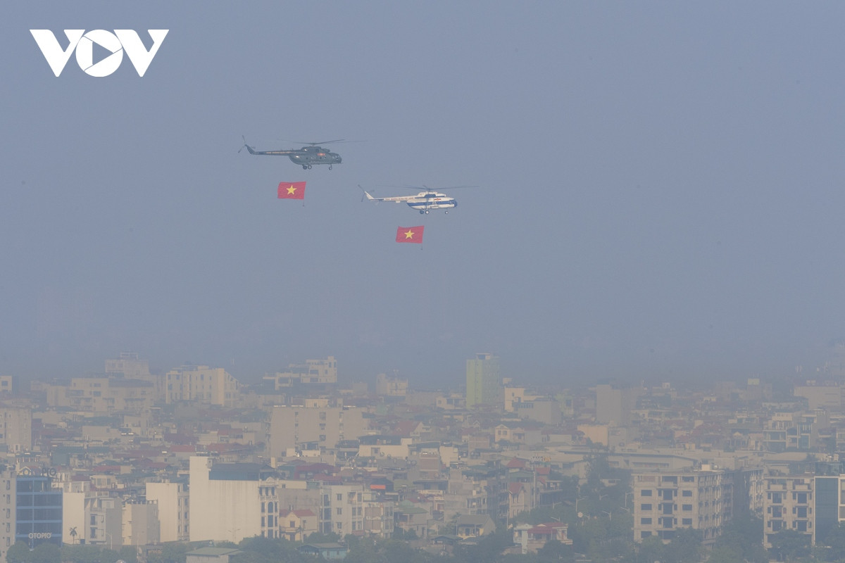 Trực thăng Mi mang Quốc kỳ và chiến đấu cơ Su-30 hợp luyện trên bầu trời Hà Nội