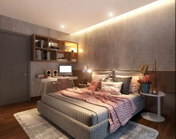 Căn hộ của Trung Quân được thiết kế khá sang trọng, hiện đại với tone màu hồng và ghi là chủ đạo. Ngoài ra, tranh treo tường và đèn chiếu sáng rất lạ mắt.
