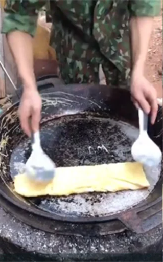Trong clip, có thể thấy người này làm món trứng cuộn chỉ nhờ vào sự trợ giúp của một cái bếp than, chiếc chảo to, một đôi đũa và cái muỗng.