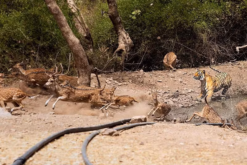 Theo chia sẻ của nhiếp ảnh gia, con hổ vằn đã nấp trong bụi cây gần hố nước tự nhiên khá lâu trước khi những con hươu xuất hiện và đến gần hố nước để giải khát.