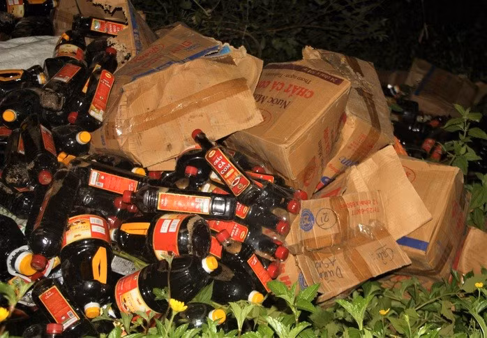 Đến trưa 19/6, lực lượng chức năng đã hoàn thành việc thu gom toàn bộ số lượng chai nước mắm vứt bỏ ở ven đường, vận chuyển lên xe tải đưa về cơ quan phục vụ công tác điều tra, xác minh người đã vứt lô hàng này.