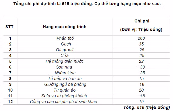Về vấn đề kinh phí xây dựng, 515 triệu đồng gia đình dự trù không phải là lớn nhưng KTS sẽ cân đối để gia đình có phương án xây dựng phù hợp và tiết kiệm chi phí tối đa.