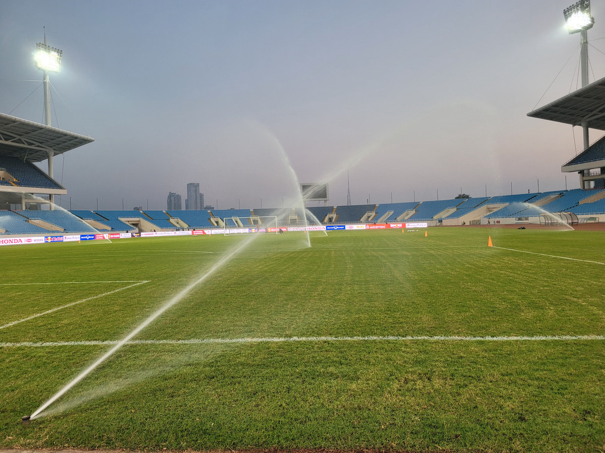 Trước khi các cầu thủ tuyển Việt Nam tập luyện, mặt sân Mỹ Đình đã được tưới nước để đảm bảo đủ độ ẩm.