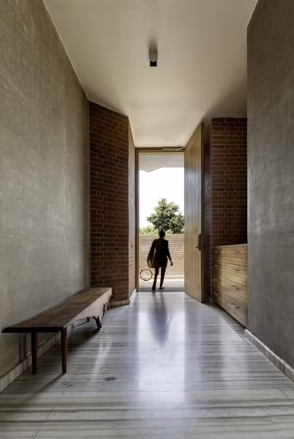 Dọc theo hành lang là các bức tường bằng đá cẩm thạch trắng, đây là điểm nhấn đối lập với màu đỏ của gạch nung bao bọc bên ngoài ngôi nhà.