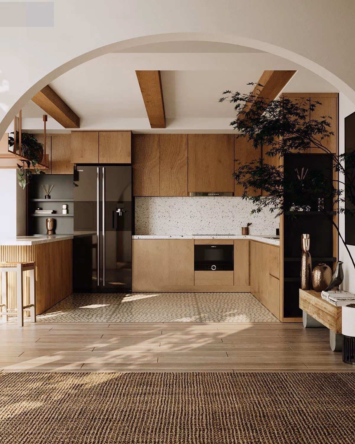 Gỗ được dùng đa số trong nhà kết hợp gỗ tự nhiên và gỗ thịt, giá kệ phẳng phiu giúp căn hộ ngăn nắp, ấm cúng.