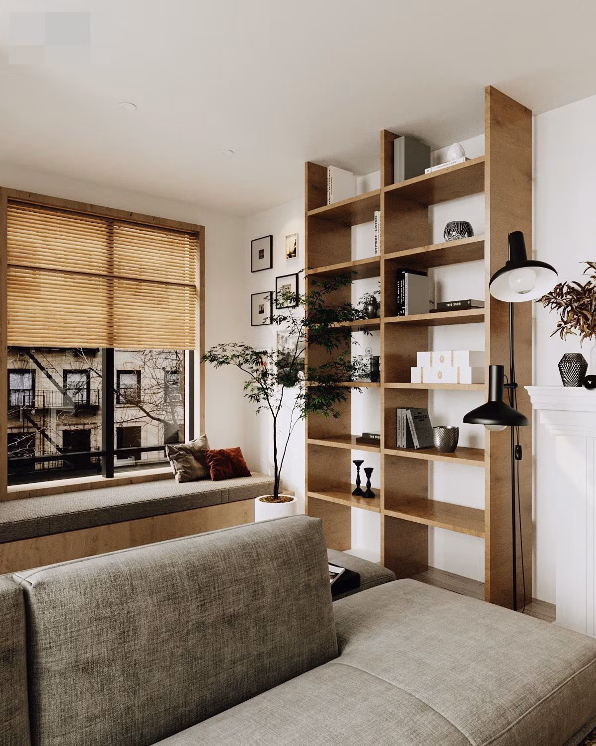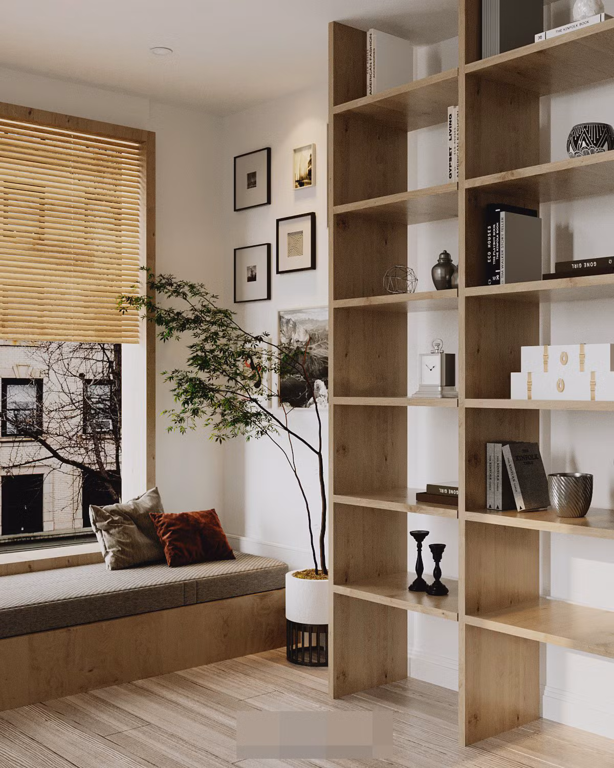 Cây xanh là thứ không thể thiếu trong các công trình hiện đại, giảm bớt sự khô cứng của nội thất, tạo ra môi trường trong lành. Phần cửa sổ bố trí thêm ghế văng đọc sách tích hợp hộc đựng đồ.