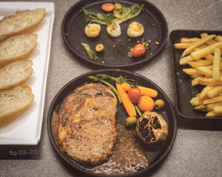 Món beefsteak (bò bít tết) ăn kèm khoai tây chiên, bánh mì và salad là một gợi ý không nên bỏ qua cho bữa tối lãng mạn.