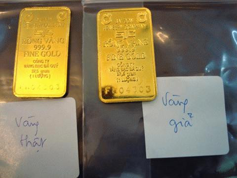 Vàng làm nhái dưới 2 hình thức gồm: miếng vàng SJC thật bị bào ở 2 bên và 4 cạnh, nên nhỏ hơn miếng vàng thật. Vì vậy, mỗi lượng bị mất từ 2-5 phân vàng tương ứng với 2-5% giá trị. Vàng nhái được bọc lại bằng bao bì giống y hệt bao bì của vàng thật SJC nên rất khó phân biệt. Loại nhái thứ 2 là vàng miếng SJC được làm nhái hoàn toàn từ kích cỡ, trọng lượng, dấu hiệu nhận diện trên miếng vàng. Loại này thay vì làm bằng vàng 4 số 9999 thì vàng nhái chỉ đạt mức 95-96% (ăn gian tuổi vàng). Các miếng vàng giả đã được phát hiện có mã số seri FH, FF, FA. Trong đó, một mã seri chưa được SJC sản xuất. Các cửa hàng phát hiện ra vàng giả thì không nằm trong hệ thống đại lý do SJC mở.
