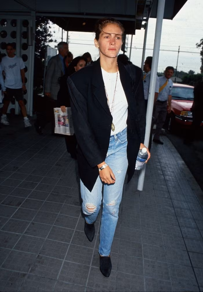 Vẻ thanh lịch của Julia Roberts khi diện blazer cùng quần jeans đã thúc đẩy nhiều cô gái học theo. Đến nay, công thức phối đồ này thường xuyên được áp dụng trong trang phục thường ngày. Cả nam và nữ đều có thể mặc áo blazer cùng quần jeans ống rộng. Ảnh: Glamour, Getty.