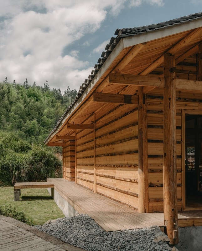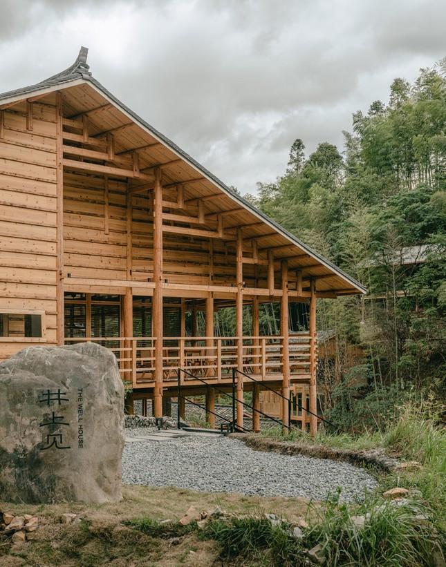 Giữa rừng tre xanh mướt, ngôi nhà nổi bật với màu vàng của gỗ linh sam.
