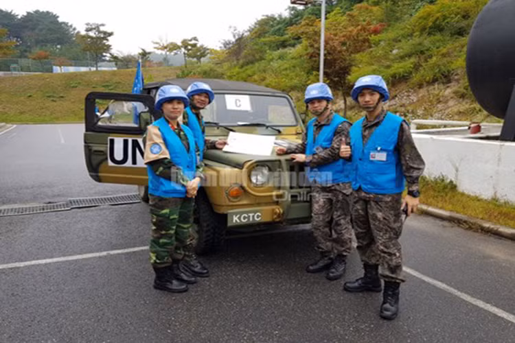 Thiếu tá Đỗ Thị Hằng Nga rạng rỡ bên các sĩ quan quân đội các nước trong khóa tập huấn tiền triển khai GGHB tại Hàn Quốc (vào tháng 8 năm 2017).