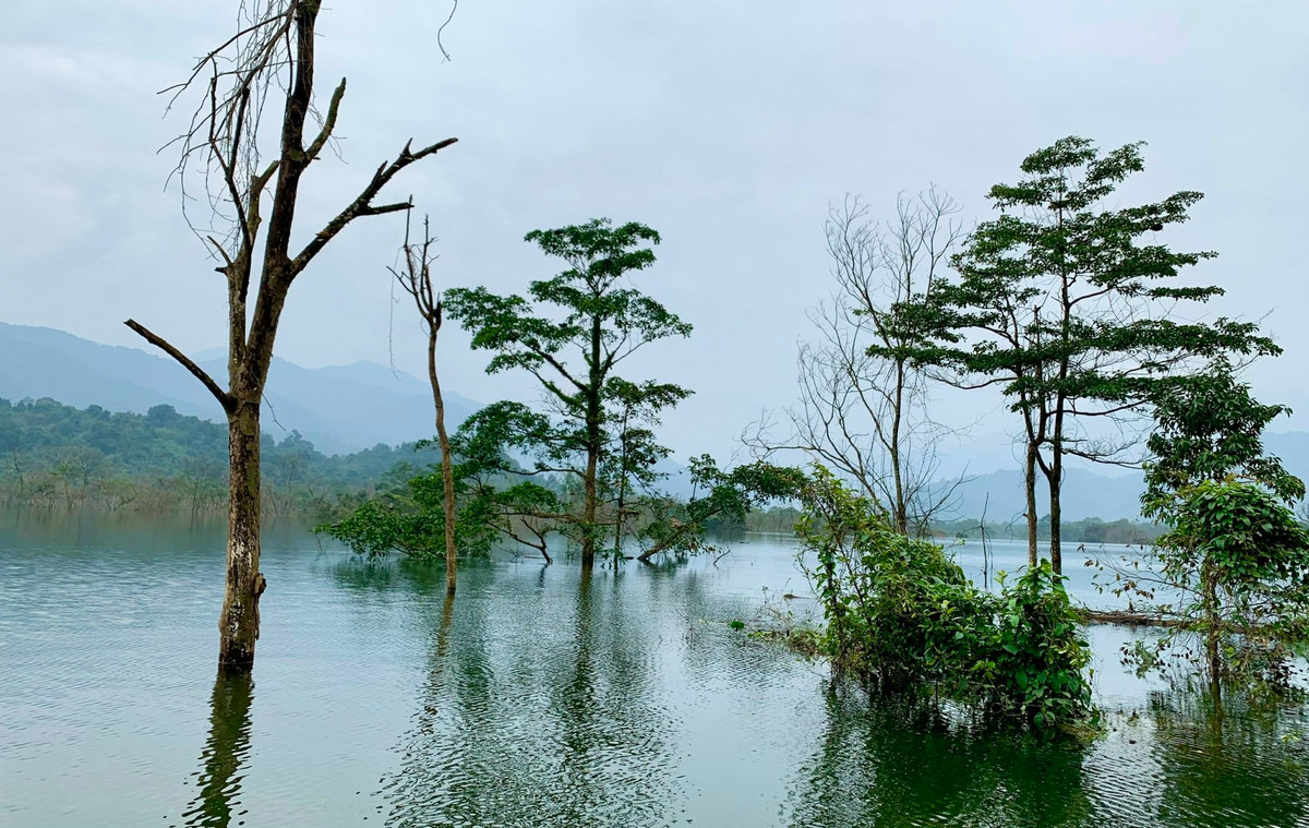 Hồ nước mênh mông xanh như ngọc giữa rừng núi.