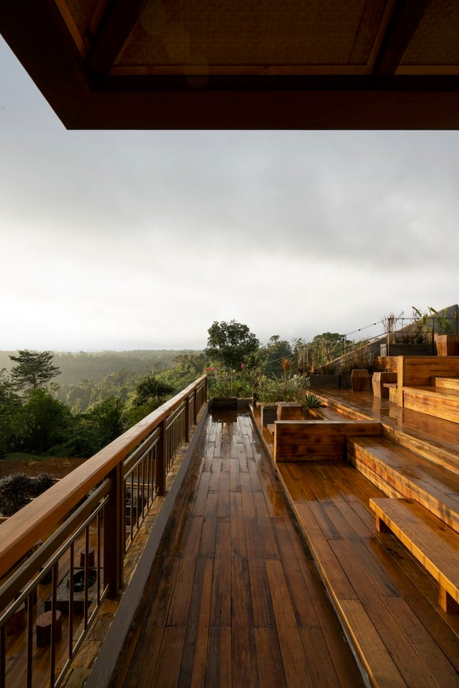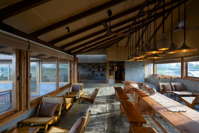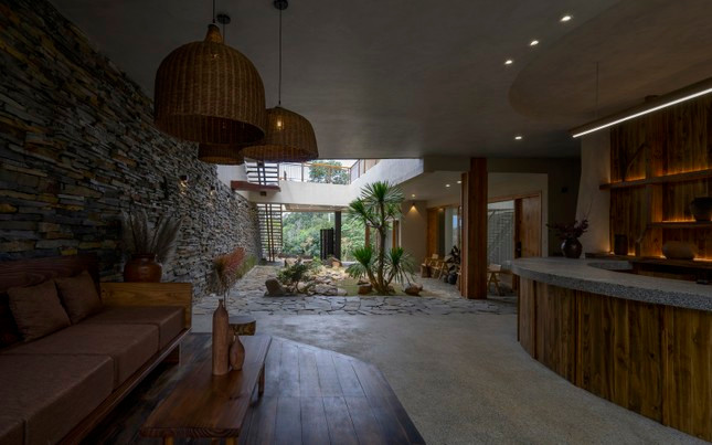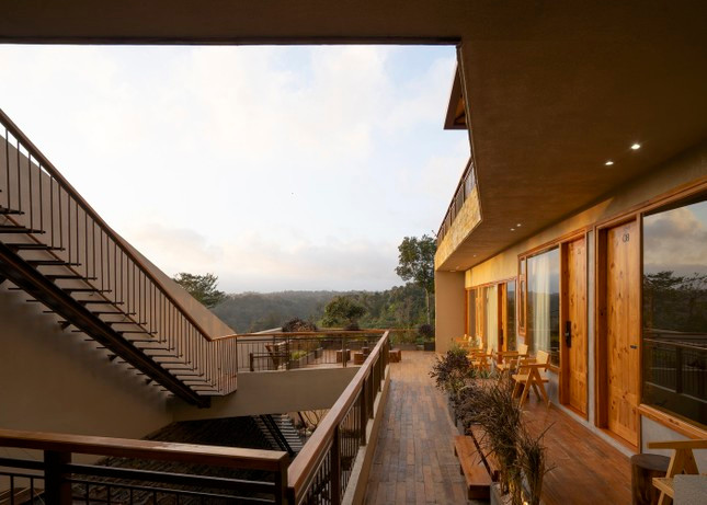 Để khai thác tối đa diện tích sẵn có và địa hình cảnh quan, nhóm KTS được thiết kế cụm phòng lưu trú ở 2 tầng dưới được bố trí theo bố cục chữ L, xoay quanh một thông tầng lớn trung tâm. Không gian cà phê được đặt ở tầng cao nhất để tận dụng ưu thế chiều cao, đồng thời là điểm ngắm hoàng hôn thơ mộng.