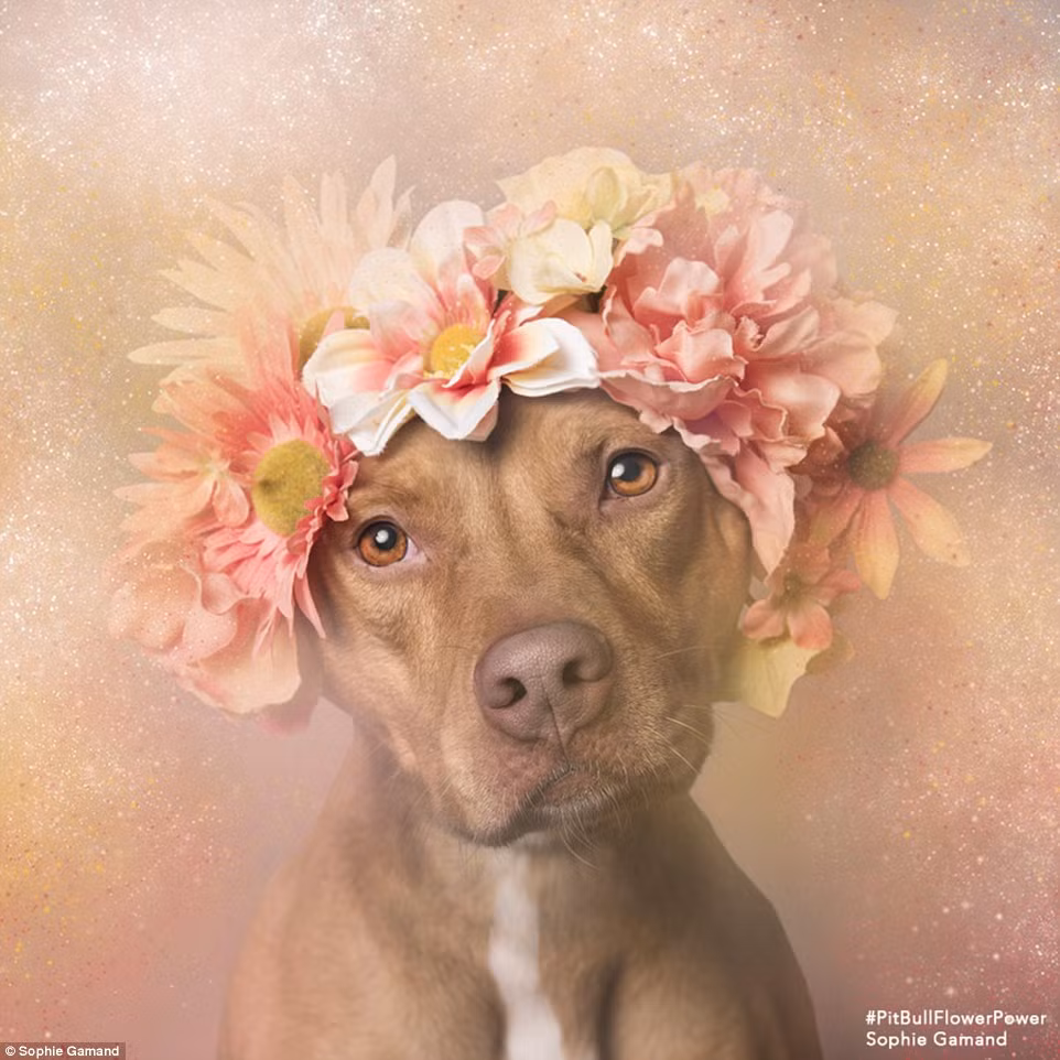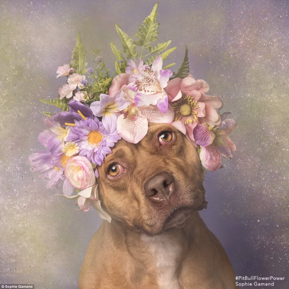 Nhiếp ảnh gia người Pháp Sophie Gamand đang sống và làm việc tại New York, đã thăm các trại cứu hộ động vật trên khắp nước Mỹ và chụp những bức ảnh tuyệt đẹp về chó pitbull đội vòng hoa, cố gắng thể hiện một vẻ đẹp mềm mại khác lạ của giống chó này.