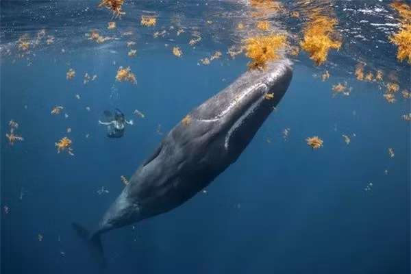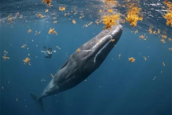 Bức ảnh của nhà nhiếp ảnh Canada Steve Woods, chiến thắng trong hạng mục Human Connection Award: People & Planet Ocean tại cuộc thi Ocean Photographer of the Year 2022. Thợ lặn tương tác tự do với một con cá nhà táng giữa đám mây cỏ dại Sargassum.