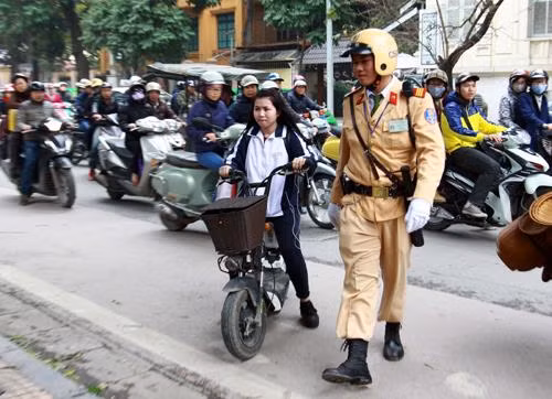 Chị Lê Kim Khánh, người quay và đăng tải đoạn clip trên cho biết, 3 học sinh không đội mũ bảo hiểm ngồi trên một xe đạp điện bị 2 chiến sĩ Cảnh sát cơ động đang tuần tra phát hiện và yêu cầu dừng xe kiểm tra.