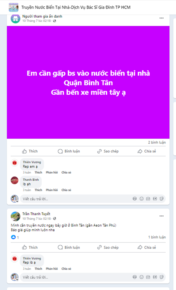 Đăng tin trên nhóm “Truyền nước biển, truyền dịch tại nhà TP HCM”, người dùng Facebook có tên Lê Thị Thanh Tuyền cho biết: “Sáng mai, em cần truyền nước biển tại nhà ở quốc lộ 13 Hiệp Bình Chánh Thủ Đức, ai có inbox em nhé”…