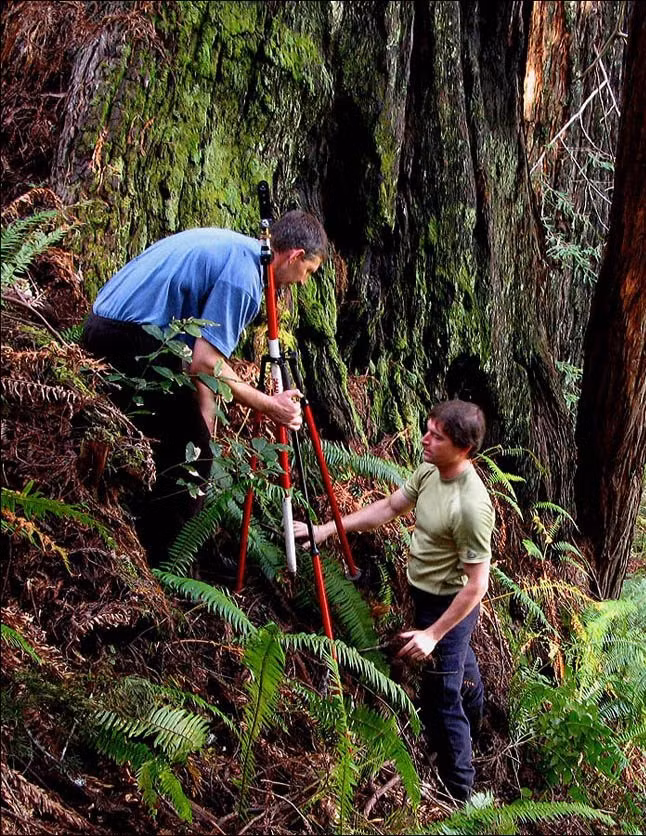 Sau khi tìm thấy cây hồng sam Hyperion - được đặt tên theo người cha Titan của Helios theo thần thoại Hy Lạp, họ liên hệ với nhà sinh vật học Steve Sillett (Đại học Humboldt, California) - người đến giúp đo đạc cây bằng một máy ảnh quang trắc laze. Ảnh: MDVaden.