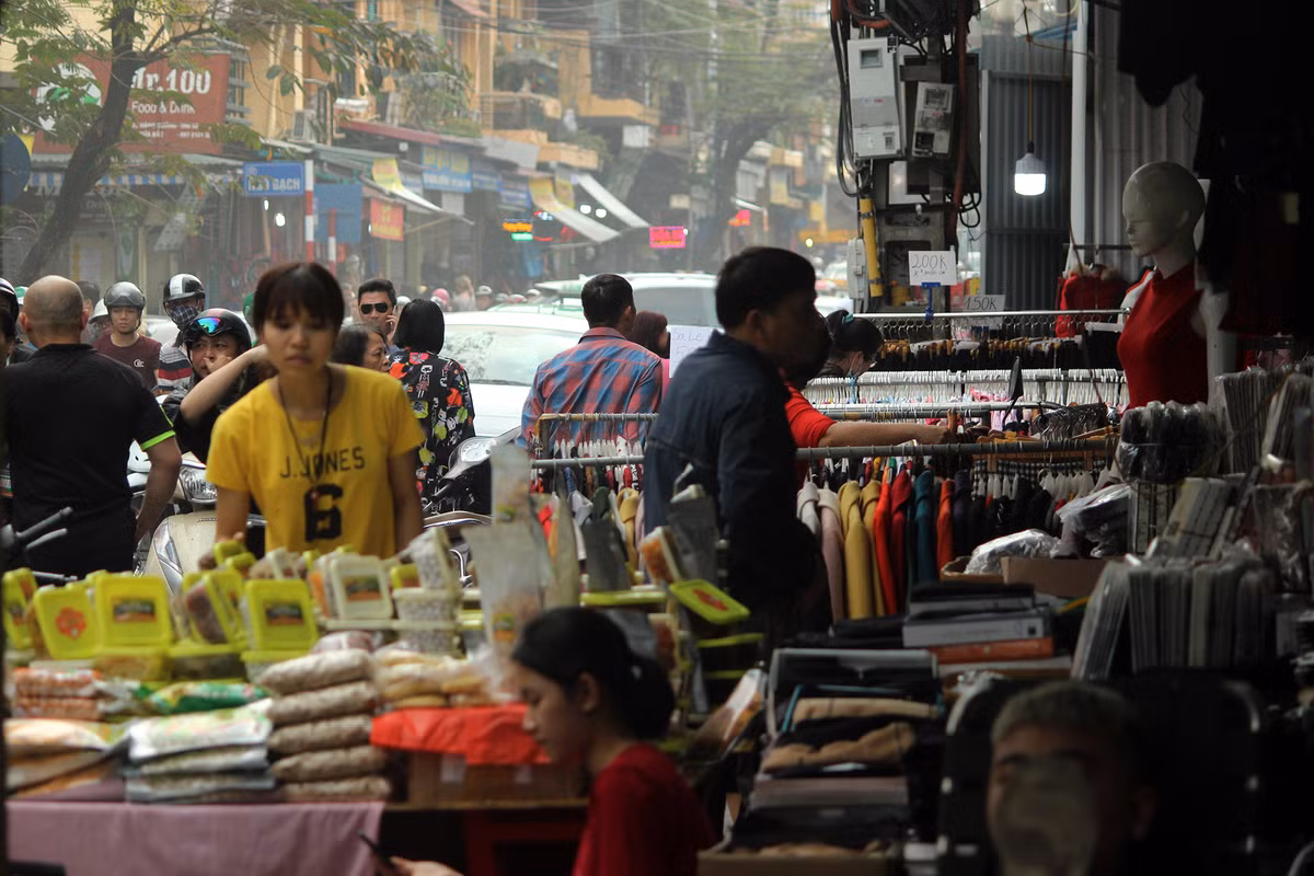 Nhiều cửa hàng treo biển giảm giá, hiên ngang bày khắp vỉa hè, chặn hết lối của người đi bộ.