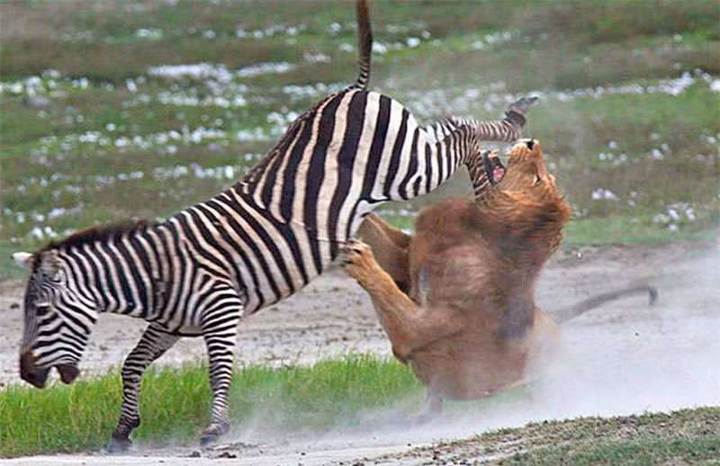 Thực tế đã từng ghi nhận ngựa vằn có thể giết chết một con sư tử đực châu Phi nặng 280 kg chỉ bằng một cú đá vào cơ thể.