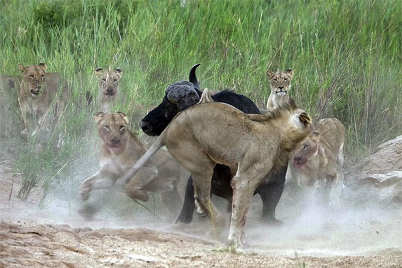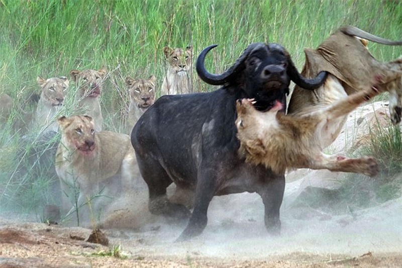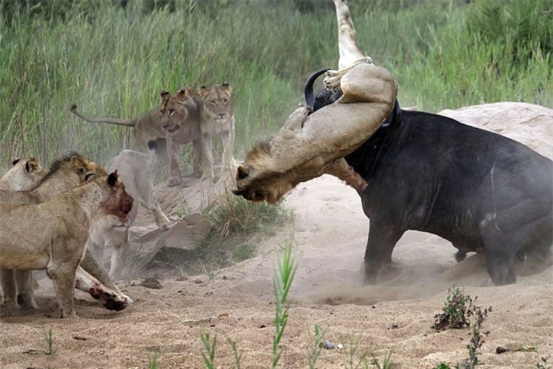 Mặc dù bị cả đàn sư tử bao vây, song sự dũng mãnh đã giúp chú trâu rừng tạo ra một màn thoát chết vô cùng ngoạn mục. Thậm chí, nó còn đủ sức để khiến một con sư tử dính đòn khá nặng.