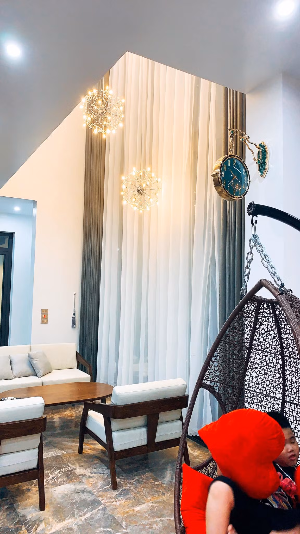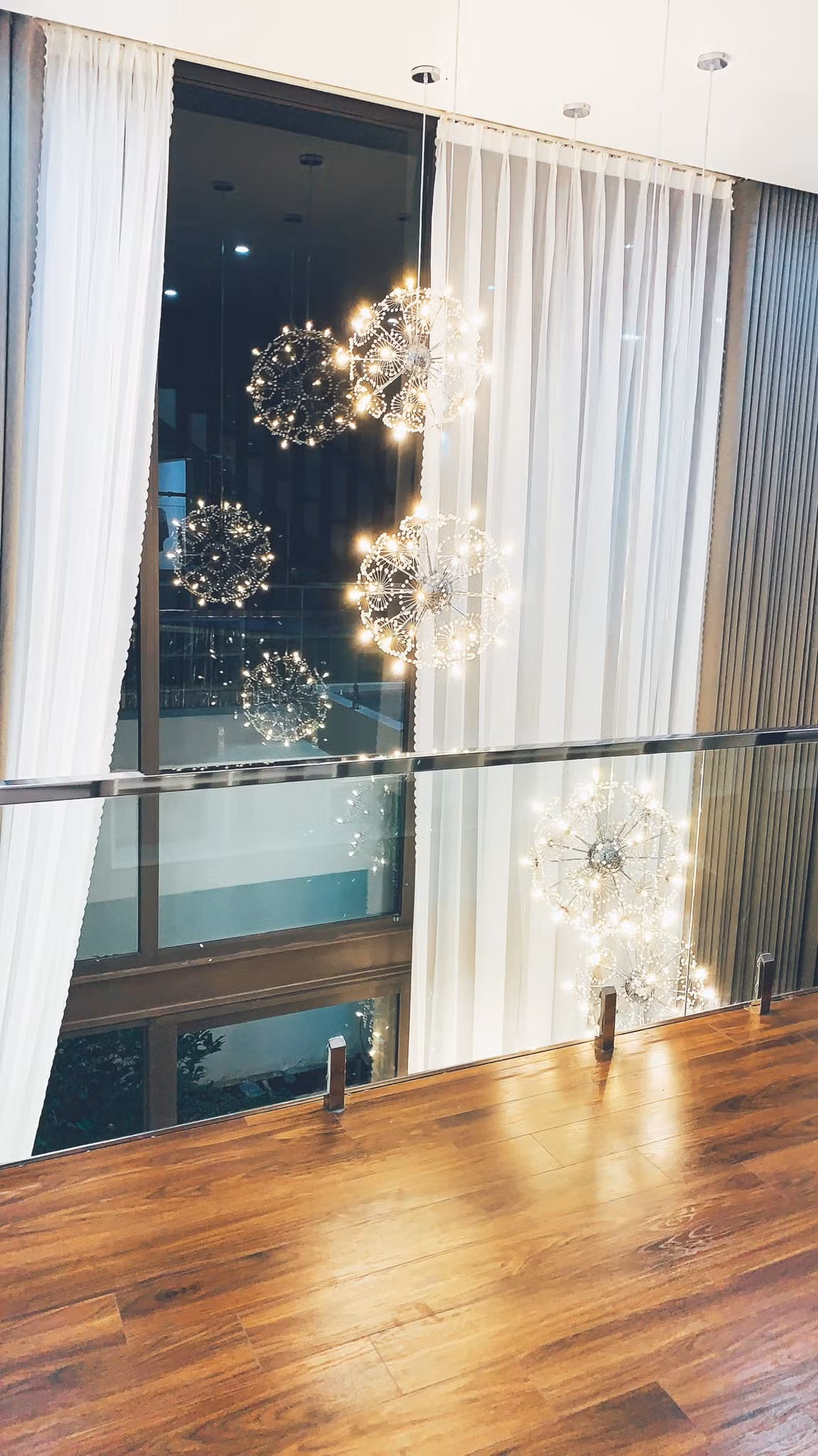 Khoảng thông tầng gia chủ bố trí đèn chùm hình quả cầu tuyết, cung cấp ánh sáng đồng đều và tăng tính thẩm mỹ cho khu vực tiếp khách.