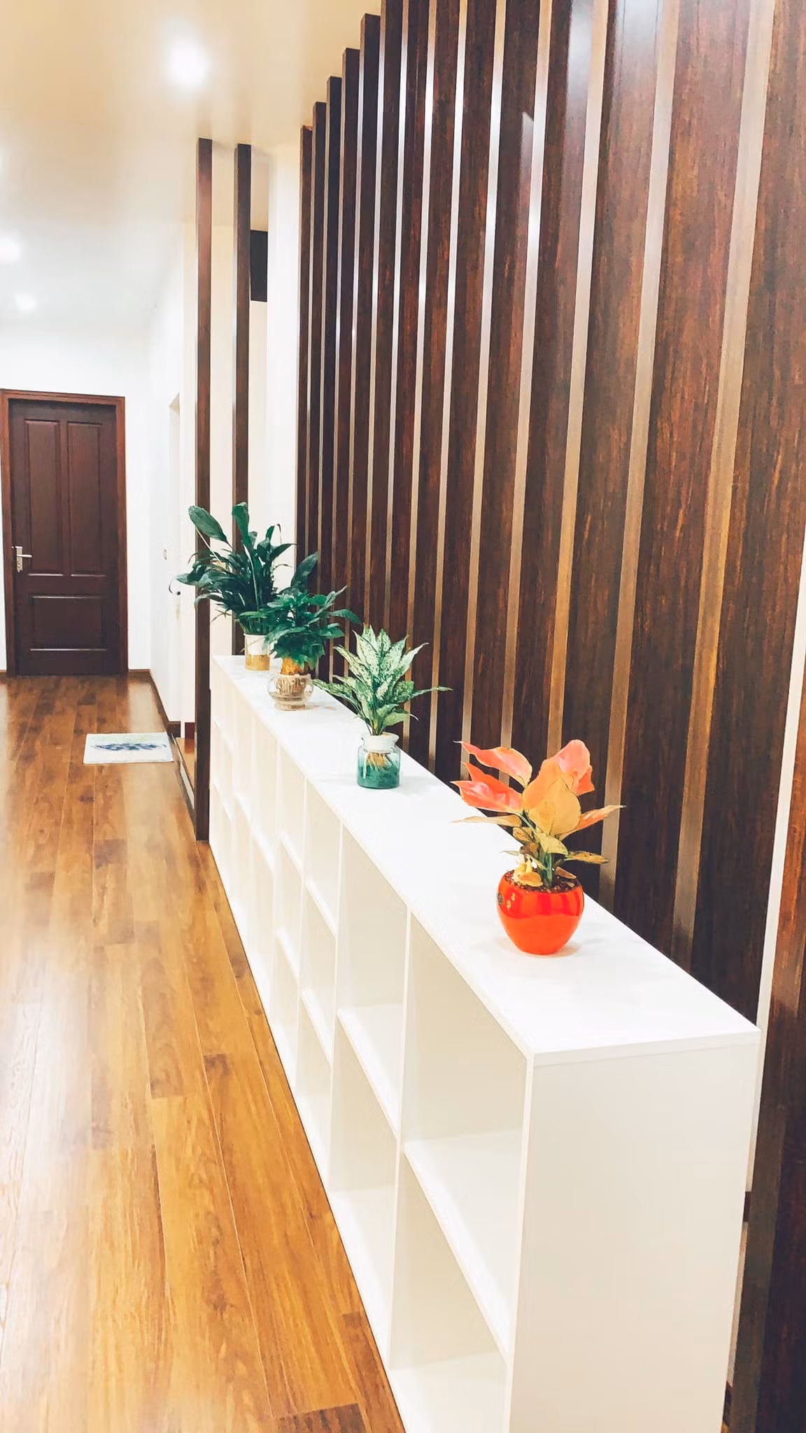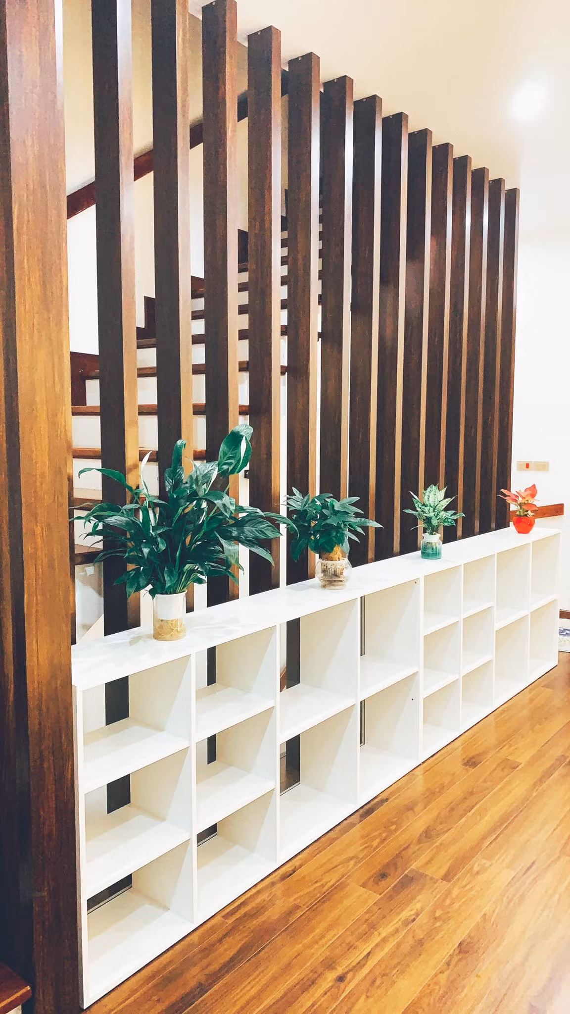 Tiếp giáp cầu thang là hàng lam gỗ kết hợp kệ trang trí màu trắng. Chiếc kệ này có thể kê các tượng nhỏ hoặc bày cây cối.