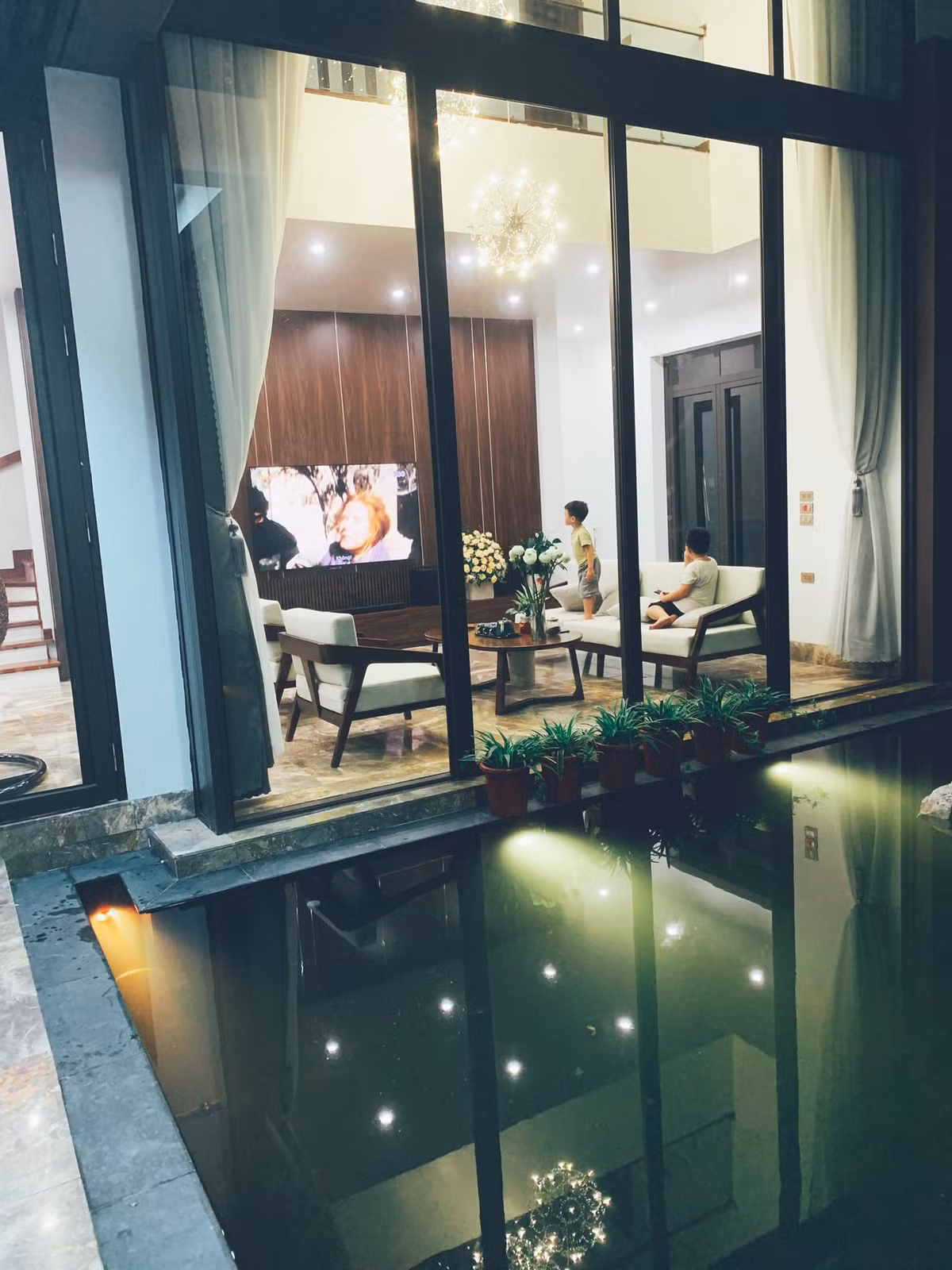 Căn biệt thự nhà vườn 2 tầng với 3 mặt kính, xây theo kiểu chữ L của vợ chồng chị Lê Ngà và anh Nguyễn Đạt ở Hưng Yên.
