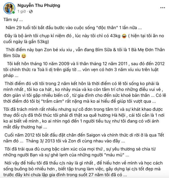 Mới đây, trên trang cá nhân của mình, Thu Phượng đã trải lòng về cuộc hôn nhân đã qua với MC Thành Trung. Vợ cũ MC Thành Trung cho biết, bản thân đã từng trầm cảm nặng, từng tự trách mình rất nhiều: "Năm 29 tuổi tôi bắt đầu bước vào cuộc sống "độc thân" 1 lần nữa. Đây là bộ ảnh tôi chụp kỉ niệm đó, lúc này tôi chỉ có 43kg (hiện tại tôi ăn no cuối ngày là gần 53kg). Thời điểm này bạn Zon bé xíu xiu, vẫn đang bỉm sữa và tôi là một bà mẹ đơn thân bỉm sữa.