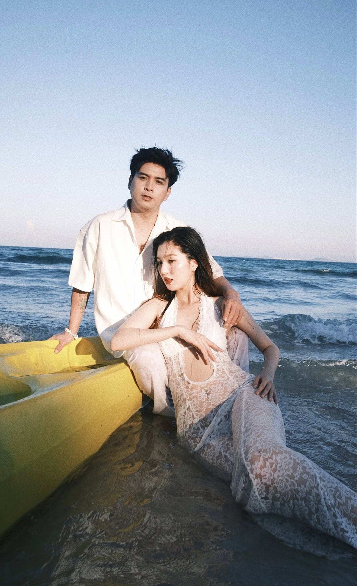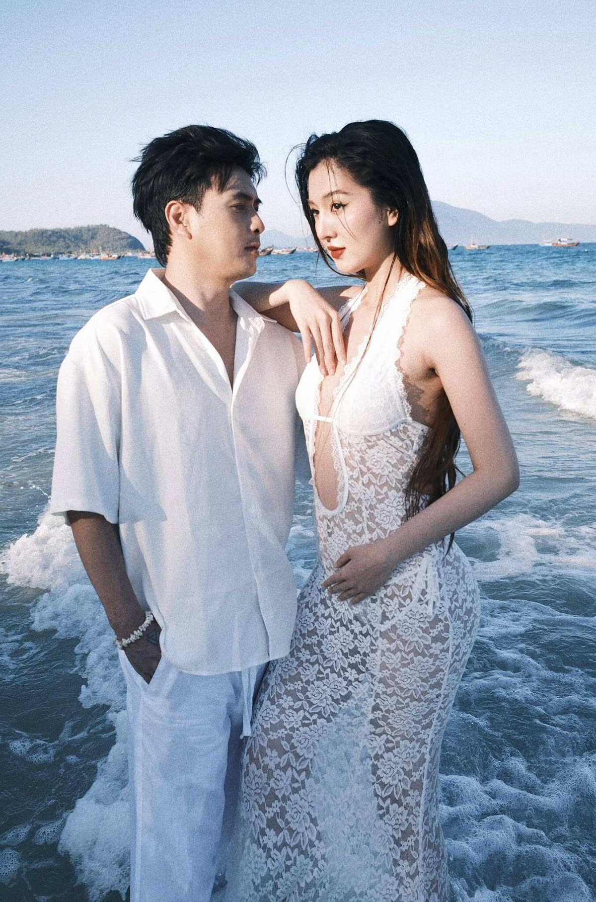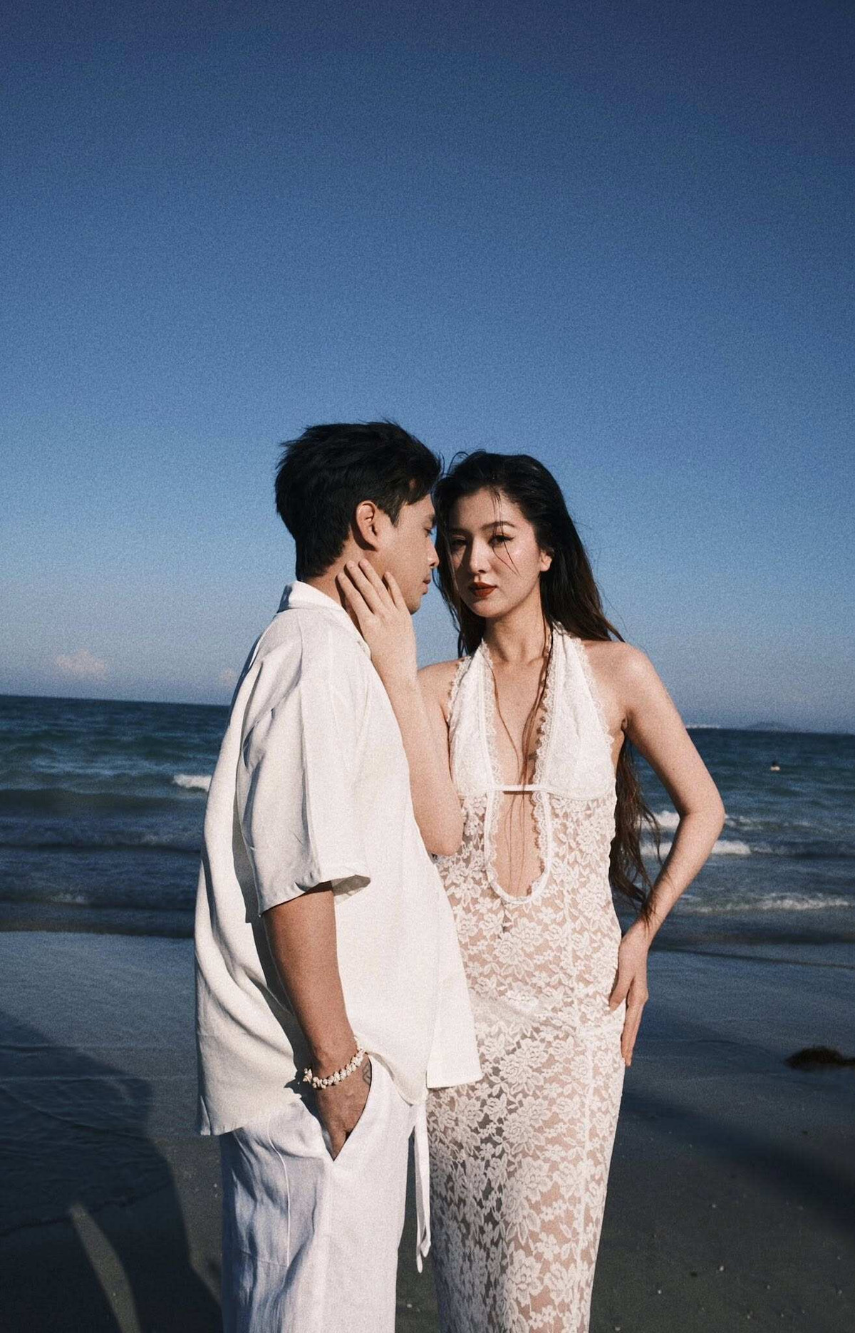 Trước đó, Tuệ Như cùng ông xã đã tung ra bộ ảnh tình tứ bên bờ biển trong bộ đồ quyến rũ không kém. Cô diện chiếc váy ôm sát cơ thể, khoe khéo đường cong sau sinh và làn da trắng mịn. Với phần cổ yếm khoét sâu táo bạo, cùng chất liệu ren hoa mỏng nhẹ, bộ trang phục mang đến vẻ đẹp vừa quyến rũ vừa tinh tế, không phô trương nhưng vẫn đủ sức “đốt mắt” người đối diện.