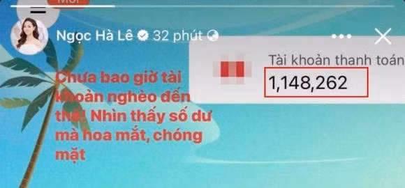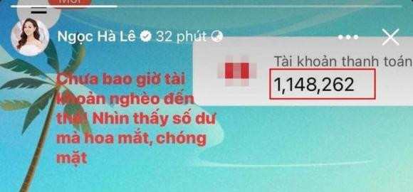 Ngọc Hà không ngại đăng tải ảnh chụp màn hình với số dư vỏn vẹn là 1 triệu 148 nghìn 262 đồng. Đính kèm với hình ảnh là dòng chia sẻ: "Chưa bao giờ nghèo đến thế. Nhìn thấy số dư mà hoa mắt, chóng mặt". Chia sẻ của Ngọc Hà khiến mọi người xót cho cô. Từ khi Công Lý bị bệnh, một mình cô đã quán xuyến chuyện tiền bạc và chi tiêu trong gia đình lẫn chi phí chữa bệnh cho chồng.